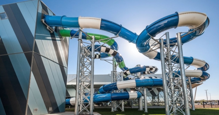 Craigieburn Aquatic Centre was a complex build, the first to move from an insulated panel roof to a built up system, whilst still maintaining the requirement for an airtight envelope. On top of that, considerations needed to be made to cater for condensation control as well as thermal and acoustic requirements. The wall cladding featured metallic Kingspan panels on angle, even to the 14m high slide tower. Built through the middle of one of the worst winters in living history, the project got off to a wet start however the end result is magnificent and enjoyed by almost 600,000 visitors each year.